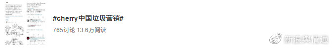 部分輿論認為@CHERRY中國 作為官博言辭不當,掀起民眾仇視女權者的情緒,為博取流量而惡意營銷,截至6月3日,微博話題#CHERRY中國垃圾營銷#已經達到了13.6萬的閱讀量,引發(fā)了765次的討論。