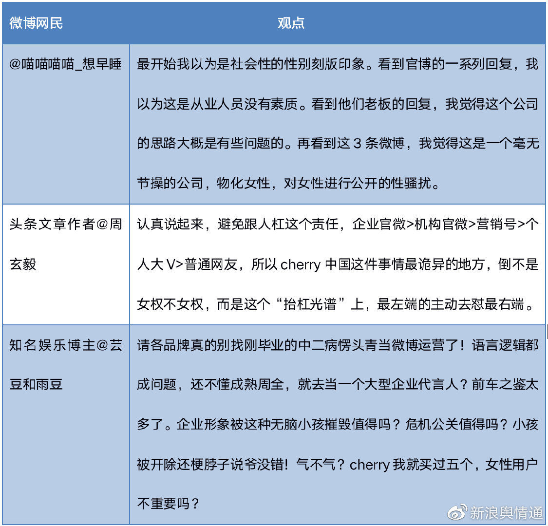 部分輿論反對田園女權,認可 @CHERRY中國 的做法,認為這次公關提升了品牌知名度。知名互聯(lián)網資訊博主@霜葉 發(fā)博稱“真的危機事件才需要危機公關。沒危機的話哪用得著危機公關。#CHERRY中國# 這件事,影響力擴大了,免費得到了價值上百萬的品牌推廣,企業(yè)形象非常正面,擴大了用戶群和銷量。這是公共關系管理的超正面案例,能進公關課程案例那種。”