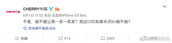 6月1日11點03分,CHERRY官博發(fā)博“我給妹子們的口紅和香水還抽不抽了?”