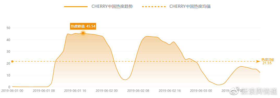據新浪輿情通數據統(tǒng)計,在6月1日至6月3日期間,“CHERRY事件”全網相關信息量51萬條。截至3日,#CHERRY中國性別歧視#等相關話題,總閱讀量為556萬次,討論為7千條。全網熱度指數趨勢圖上看,“CHERRY中國”3日內熱度指數均值為21.25,峰值為45.54,經分析,熱度峰值出現在6月1日16時,@CHERRY中國 連續(xù)發(fā)布多條微博反擊“田園女權者”,引發(fā)大量網民轉發(fā)討論,是聲量高漲的主要原因。