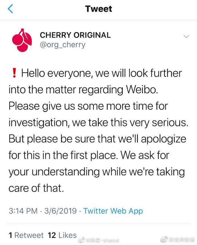 6月3日下午,Cherry總公司推特發(fā)公告“請給我們多一點時間調查”