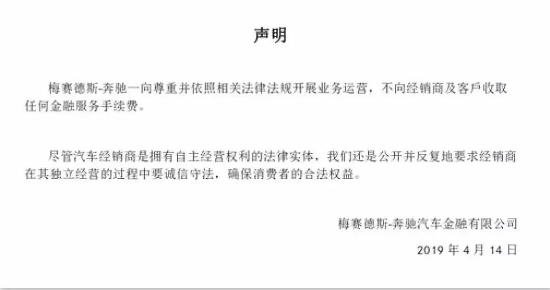 在扯出“金融服務(wù)費(fèi)”后,梅賽德斯-奔馳汽車金融有限公司在4月14日下午五點(diǎn),也發(fā)布了一則聲明:表示公司一向依照相關(guān)法律法規(guī),不向經(jīng)銷商和客戶收取任何金融服務(wù)手續(xù)費(fèi)。