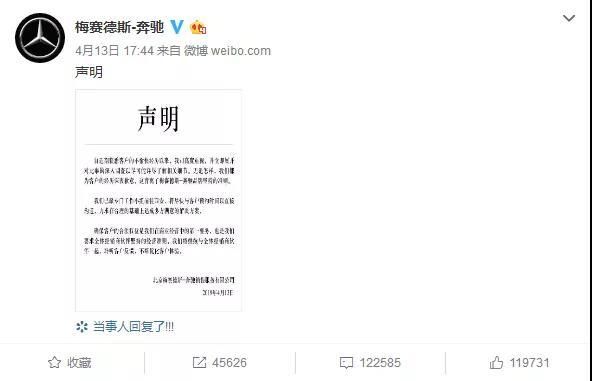 4月13日下午五點(diǎn),梅賽德斯-奔馳銷售服務(wù)有限公司通過(guò)官微首次發(fā)布了聲明。