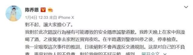 其次是陳喬恩微博回應(yīng)也沒有回避問題,致歉、并就曝光的酒駕問題做了清晰的解釋。而且在致歉聲明中,我們看不到“僅”或“只有”這樣的回避性字眼。