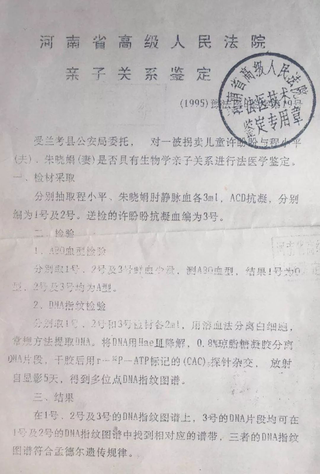 1996年1月15日,河南省高院出具了(1995)豫法醫(yī)鑒字第19號(hào)《河南省高級(jí)人民法院親子關(guān)系鑒定》,結(jié)論為許盼盼與朱曉娟夫妻具有生物學(xué)親子關(guān)系。