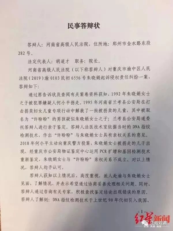 朱曉娟給記者出示了一份蓋有河南高院公章的民事答辯狀,上面的落款時(shí)間是5月10日。河南高院表示,他們對(duì)此高度重視,通過(guò)咨詢有關(guān)專家,積極查找鑒定結(jié)論出現(xiàn)錯(cuò)誤的原因。
