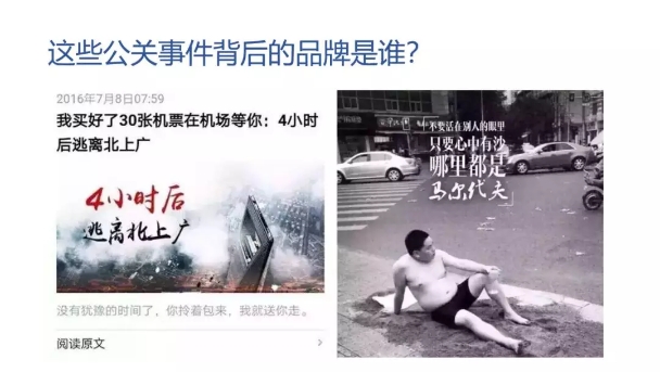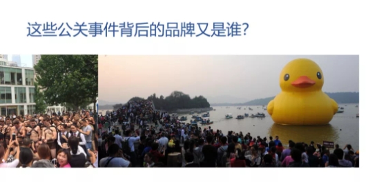 制造熱點(diǎn)是第一階,我們看看這些大家都熟悉的熱點(diǎn)事件。比如,“4小時(shí)逃離北上廣”,“只要心中有沙,哪里都是馬爾代夫”,“斯巴達(dá)三百勇士北京游行”,“大黃鴨進(jìn)大陸”。這四個(gè)熱點(diǎn)事件很多人聽說過,請(qǐng)問,這些熱點(diǎn)事件背后的品牌是誰呢?