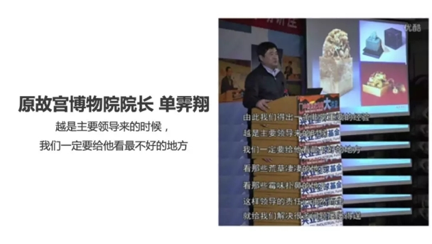 我們看一個(gè)超年長網(wǎng)紅——故宮的故事。上一任故宮博物院院長單霽翔先生問:國家領(lǐng)導(dǎo)來故宮視察,怎么報(bào)告?