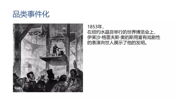 首先,是把品類價(jià)值和品類特性表達(dá)出來,品類事件化。比如今天的電梯領(lǐng)導(dǎo)者奧的斯,奧的斯先生發(fā)明了“安全電梯”,首次亮相就引發(fā)了轟動(dòng)。
