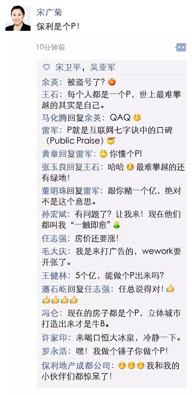 比如前幾年,保利當家人宋廣菊微博吐槽:保利是個p,旋即引發(fā)了外界的一片猜想。雖然后面被證實是為公司的營銷策略,但是保利地產(chǎn)成都公司的公關反映可謂是滿分,發(fā)了一個宋廣菊的朋友圈,地產(chǎn)和互聯(lián)網(wǎng)大佬在其朋友圈議論紛紛,看起來毫無違和。