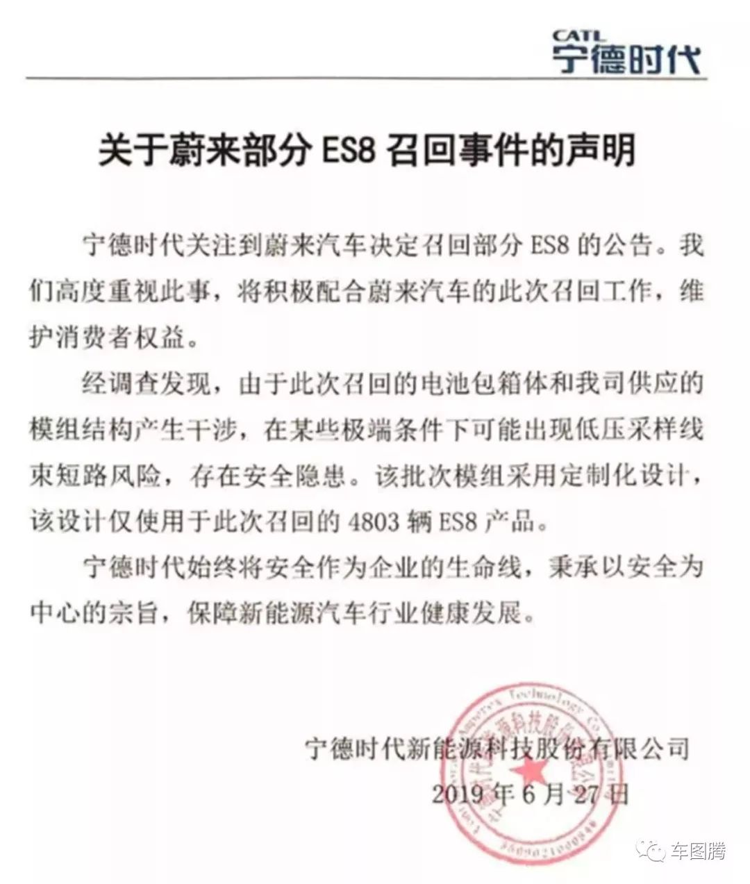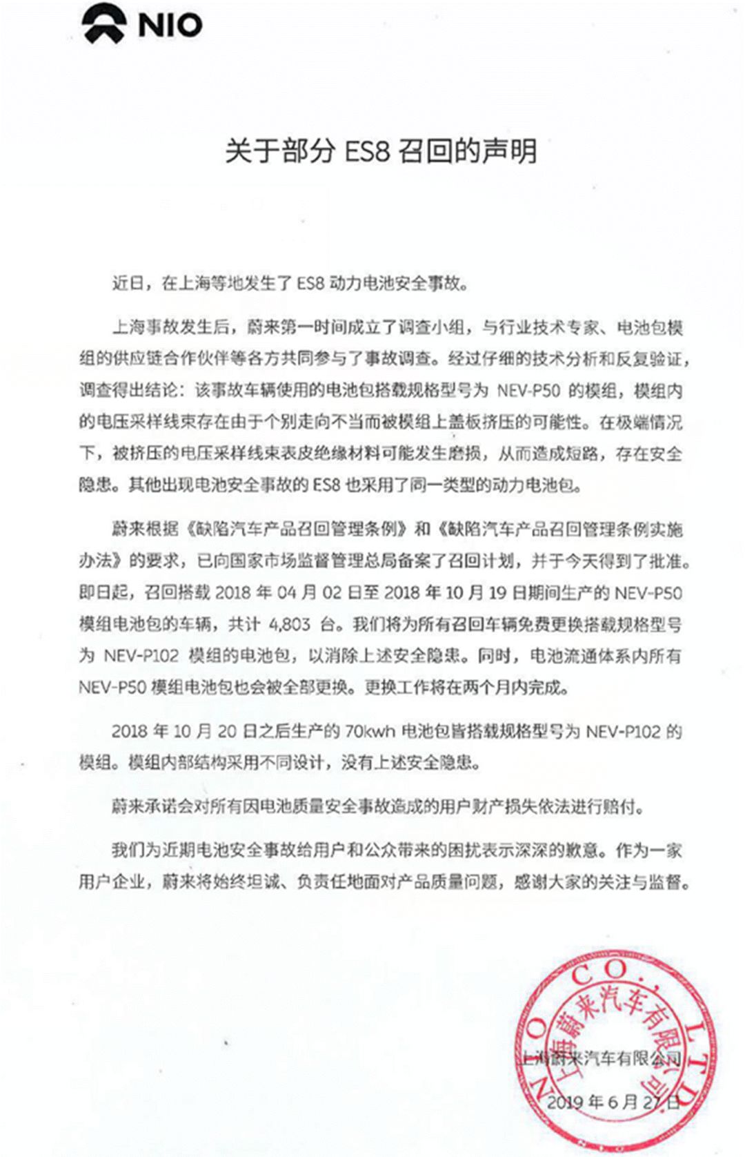 6月27日,蔚來宣布召回部分搭載了2018年4月2日到2018年10月19日期間生產(chǎn)的動(dòng)力電池包的蔚來ES8電動(dòng)汽車,共計(jì)4803輛。
