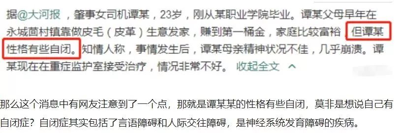 唯一能和“精神疾病”沾上一點(diǎn)關(guān)系的,是此前有媒體調(diào)查發(fā)現(xiàn)的女車主譚某“性格有些自閉”,被有些網(wǎng)友懷疑是想以自閉癥為借口脫罪。