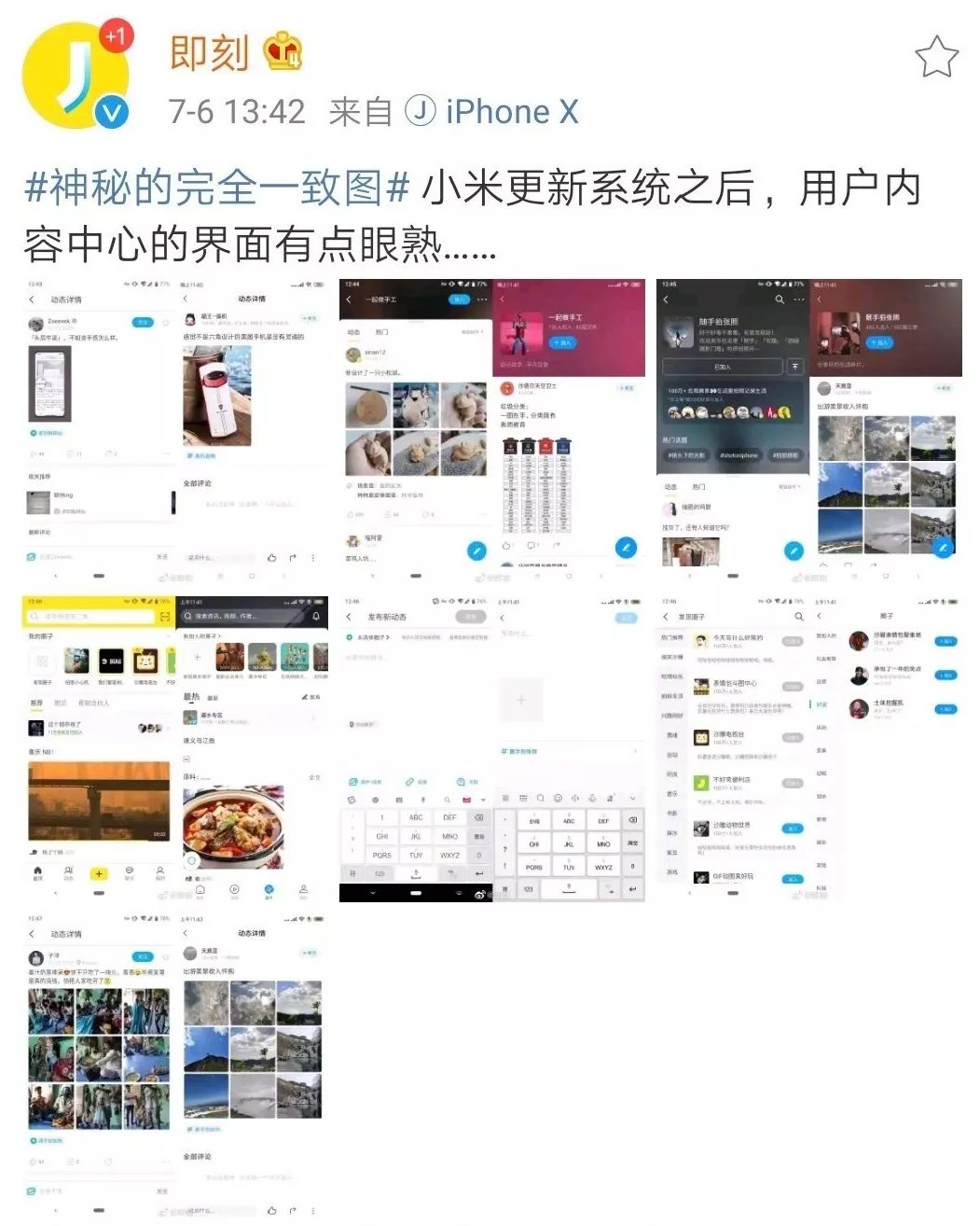 7月6日,即刻 APP 舉報小米,聲稱小米手機在系統(tǒng)更新后,其用戶內容中心界面和自家 APP 有過多的相似之處,并配上了7張關于相似之處的配圖。小米隨即作出回應。