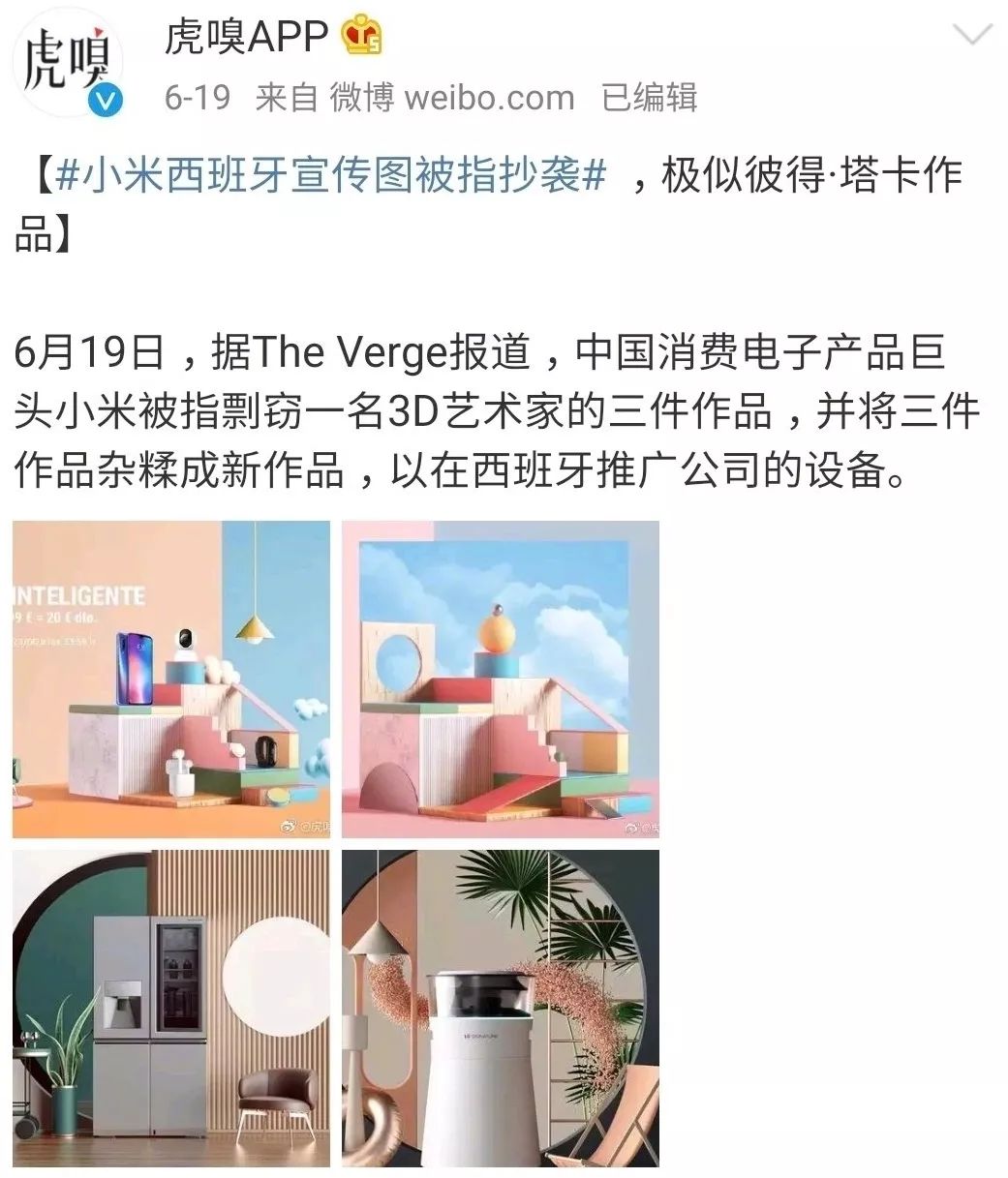 6月18日,國外設計師 Peter Tarka 通過其社交賬號發(fā)文,聲稱小米在西班牙的宣傳廣告抄襲了自己多幅作品的設計元素,包括曾為 LG 設計的項目圖。經報道轉載,國內網友紛紛聲援設計師,迫使小米作出回應。6月20日,小米發(fā)布公告承認公司員工在未經授權的情況下使用了該藝術家的作品,并當即解雇了違規(guī)員工。
