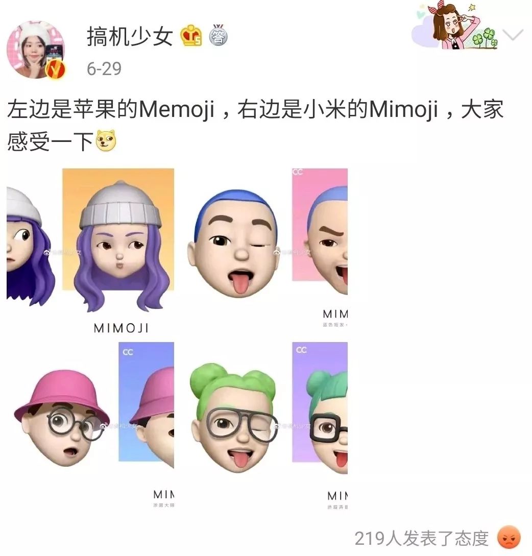 6月29日,一位微博數碼博主拋出了蘋果 Memoji 與小米 Mimoji 的對比圖,并配文:“大家感受一下。”該微博暗指小米 CC9手機的 Mimoji 功能抄襲 iPhone 的相關形象,引發(fā)眾多網友對小米的質疑和不滿。
