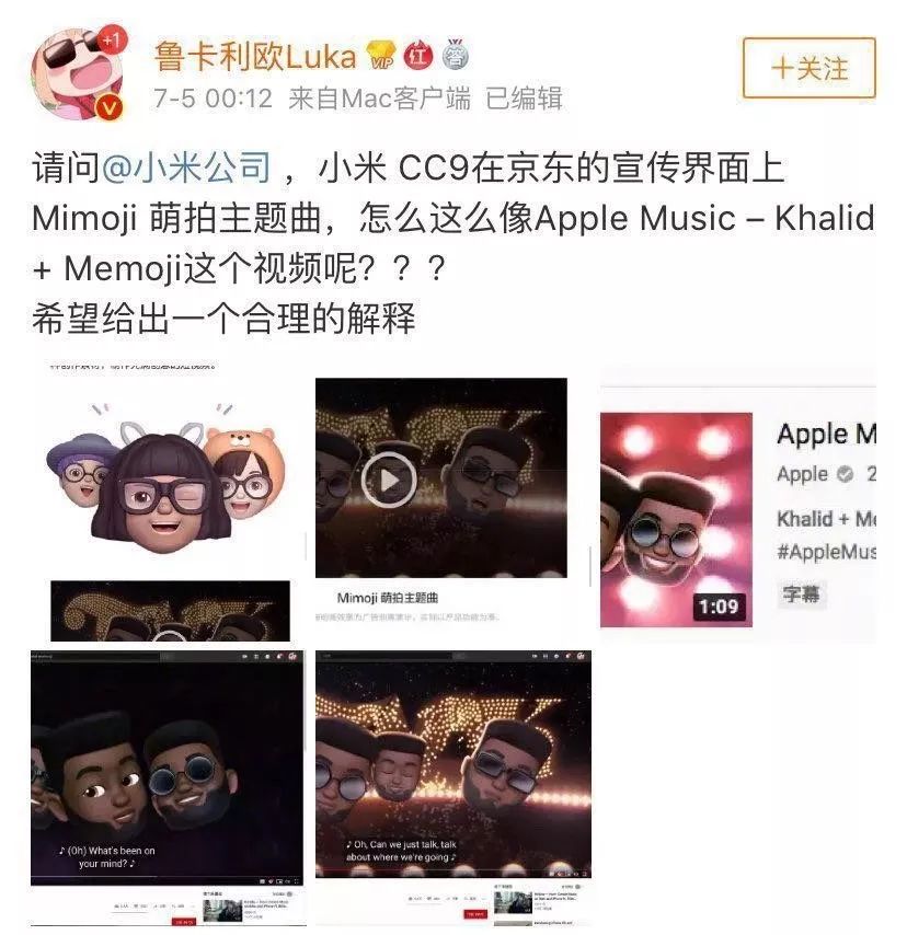 7月5日,某大 V 指出,京東商城中小米 CC9的宣傳視頻與 Apple Music 的某一視頻廣告相似度極高。對此,小米回應稱,“經查的確是相關運營團隊在京東平臺頁面上傳過程中出錯,上傳了錯誤的內容。內部正在進一步調查并將嚴肅處理。”到目前為止,該聲明發(fā)布后暫無后續(xù)。