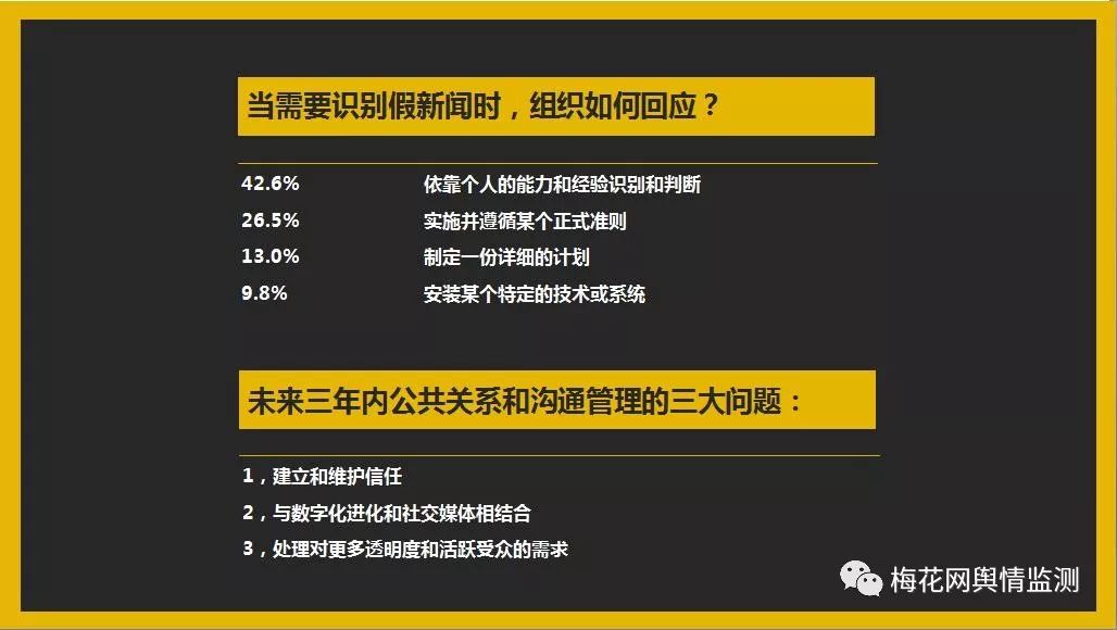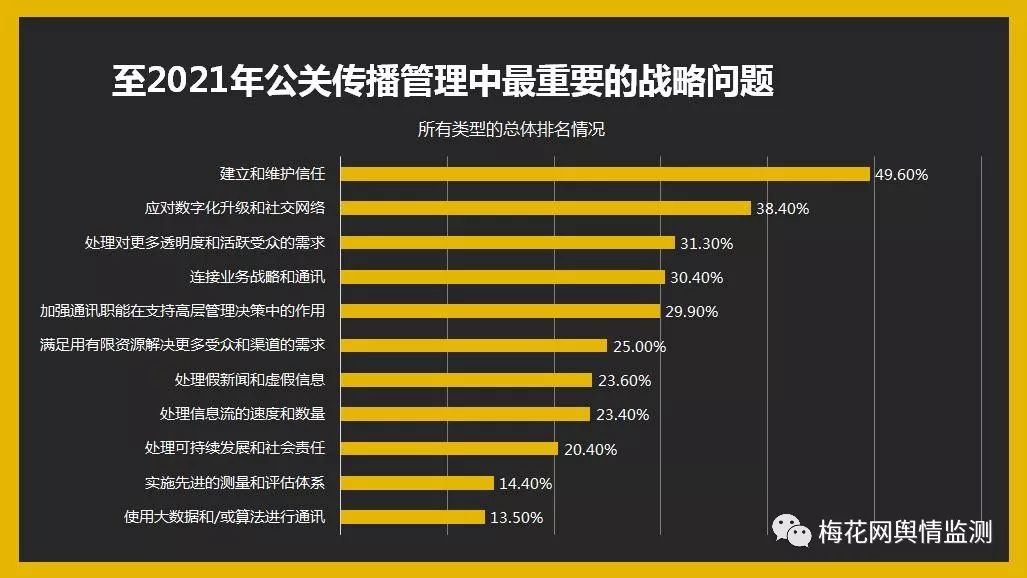 根據(jù)普朗克中心的一項(xiàng)針對(duì)加拿大和美國(guó)的公關(guān)狀況的研究。由于虛假新聞和其他虛假信息經(jīng)常滲透新聞來(lái)源,并且可能在每個(gè)(社交)角落引起聲譽(yù)危機(jī),建立和維護(hù)信任是目前公關(guān)面臨的最關(guān)鍵問(wèn)題。