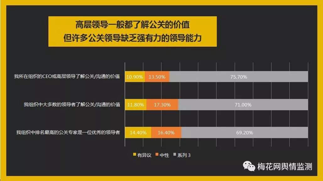 該研究加入了歐洲,拉丁美洲和亞太地區(qū)現(xiàn)有的通信監(jiān)測(cè),探討了各種主題,包括虛假新聞和處理它的策略、未來(lái)三年行業(yè)的首要問(wèn)題、幫助做決策的信息供給、領(lǐng)導(dǎo)者的表現(xiàn)、專業(yè)人士的工作投入、對(duì)組織的信任度、工作滿意度、工作壓力、社媒技能和管理學(xué)知識(shí)。