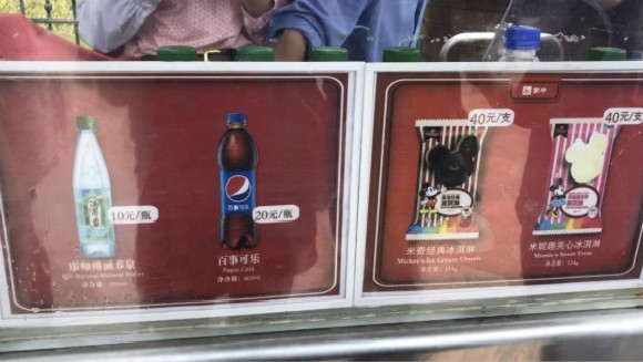 記者入園后發(fā)現(xiàn),基本每隔幾米就有銷售食品飲料的餐車及店鋪,一瓶礦泉水標(biāo)價10元,一瓶可樂20元,一支冰淇淋40元,爆米花35元一盒。