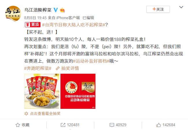 8月8日晚間19:45,就在熱搜熱度正高,全網(wǎng)輿論關(guān)注都集中在“榨菜”上時(shí),@烏江涪陵榨菜 已經(jīng)迅速開始了營銷布局,第一步,先是由官微抽獎(jiǎng)帶動(dòng)轉(zhuǎn)發(fā),爭取在最短時(shí)間內(nèi)擴(kuò)大曝光量。