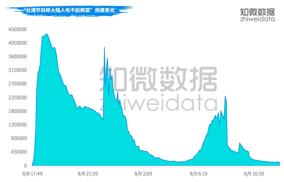 黃世聰?shù)挂矝]有夸張,在視頻于微博上發(fā)酵后,8月8日17:50,“臺(tái)灣節(jié)目稱大陸人吃不起榨菜”登上熱搜,在短短半個(gè)小時(shí)之后,18:24分,該熱搜迅速到達(dá)第一位,持續(xù)到7:36分才掉到第二。一直在9日早間8時(shí)許,該熱搜熱度才慢慢退卻。