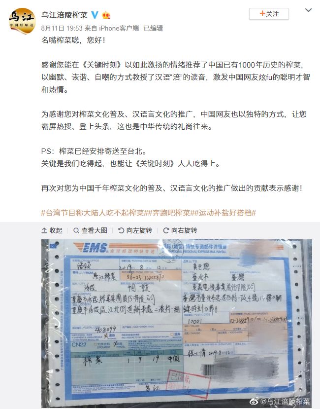 黃世聰都在facebook上公然寫上網(wǎng)址,叫板涪陵榨菜廣告費(fèi),官方又豈有不應(yīng)戰(zhàn)之理?8月11日晚間,@烏江涪陵榨菜 又隔空喊話“名嘴榨菜聰,您好!”在一番“感謝推薦”以后,以“關(guān)鍵是我們吃得起,也能讓《關(guān)鍵時(shí)刻》人人吃得上”回敬對(duì)方,并曬出一個(gè)EMS包裹的發(fā)件單——烏江榨菜真的要寄到臺(tái)北去了!