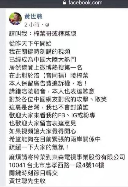 8月8日,嘉賓黃世聰在臺(tái)灣節(jié)目《關(guān)鍵時(shí)刻》上公開表達(dá)“pei陵榨菜股價(jià)大跌,說明中國大陸老百姓榨菜都吃不起”等言論,節(jié)目流傳至國內(nèi)后引起熱議。隨后其更是在facebook上發(fā)布“我的視頻登上中國大陸微博熱搜第一名”、“對(duì)涪陵榨菜保留廣告費(fèi)追訴權(quán)”,在結(jié)尾更是放上了地址,稱“麻煩請(qǐng)寄榨菜到XXX公司”。