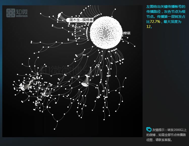 從引爆點(diǎn)參與時(shí)間來看,在@烏江涪陵榨菜 發(fā)博后不到5分鐘的時(shí)間里,@臺(tái)灣傻事 就轉(zhuǎn)發(fā)了該微博,隨后加入的是@高琪高琪高琪 @徐佳jj ,這一傳播鏈由于被@江寧婆婆 所轉(zhuǎn)發(fā),進(jìn)入了大量網(wǎng)友的信息流之中。