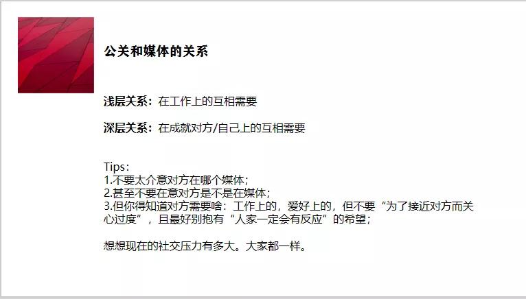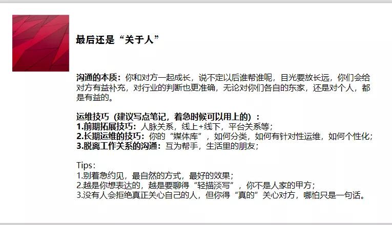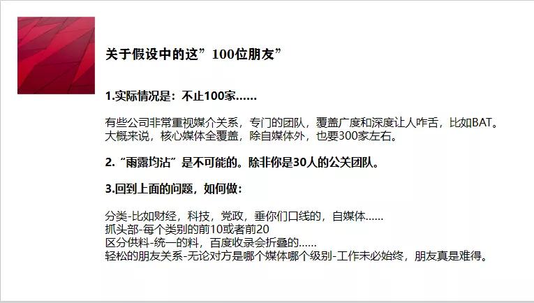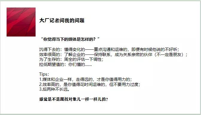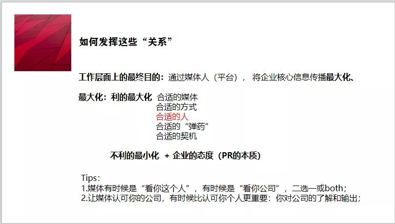 這張PPT的內(nèi)容看起來可能有些抽象,但如果真的能理解到位,那么會對公關(guān)媒體維護的工作幫助很大,至少我個人認為是非常重要的,也是我工作中的切身感受。(圖7)