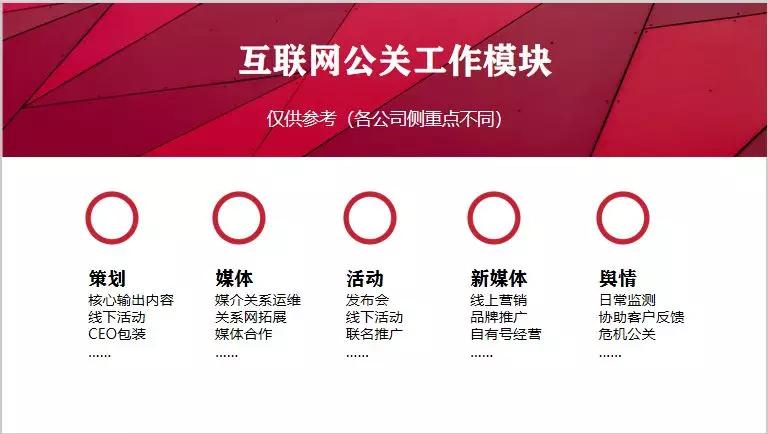 上面這張圖(圖15)是這幾年互聯(lián)網(wǎng)公司公關(guān)團隊常見的工作模塊,大致分為五類,每個模塊大類下又細分出各項工作,大家可以稍微了解一下,如果有專業(yè)的問題我們可以在課后溝通。