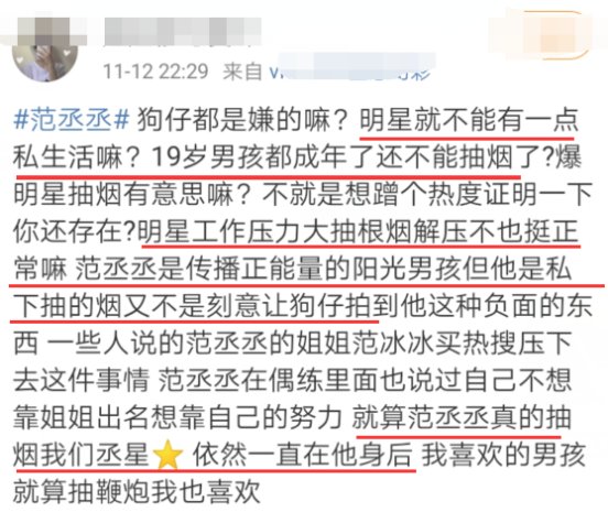 范丞丞的粉絲有理智的,但是也有很極端的,比如下面這位女粉絲。她洗白說:明星就不能有一點(diǎn)私生活嘛?19歲男孩都成年了還不能抽煙了?明星工作壓力大抽根煙解壓不也挺正常嘛?