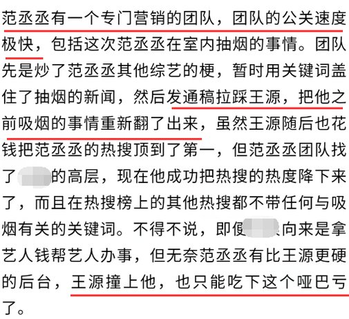 知情人士曝光了范丞丞團(tuán)隊(duì)公關(guān)手段,先炒作范丞丞其他綜藝節(jié)目的梗,暫時用關(guān)鍵詞覆蓋了抽煙新聞,然后就發(fā)布通稿拉踩王源,把王源以前北京餐廳抽煙的事情重新挖出來。