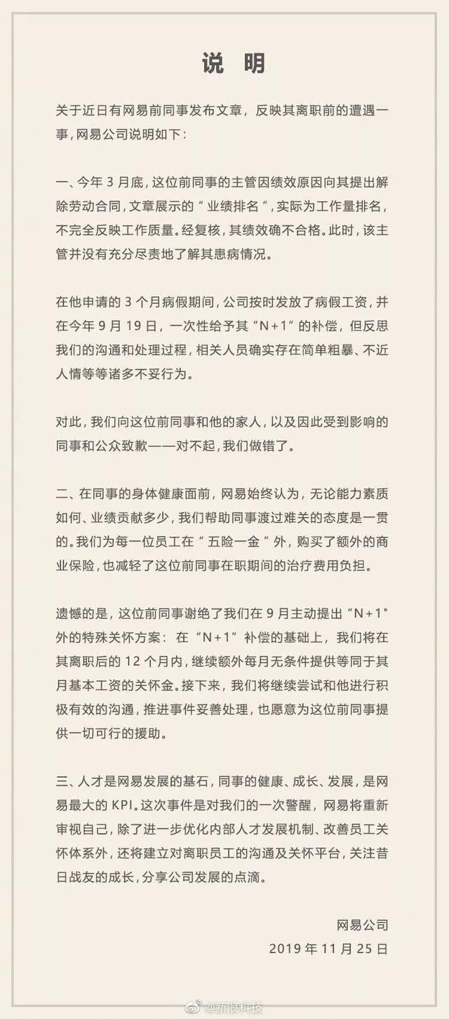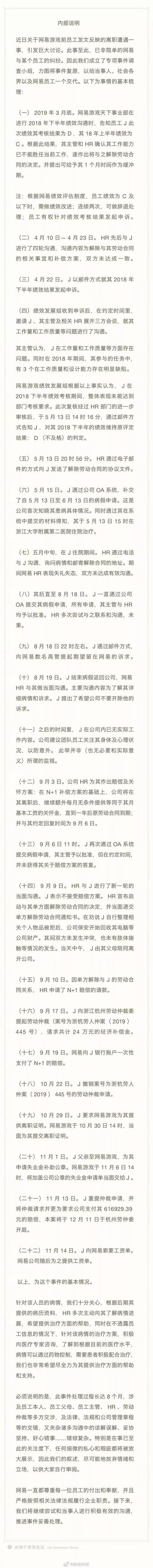 午間,,網(wǎng)易又再次發(fā)聲,對事件的時間線進行了梳理,力證自己給了該員工應有的補償,并聲明自己的處理流程在正規(guī)合法的范圍內(nèi)。