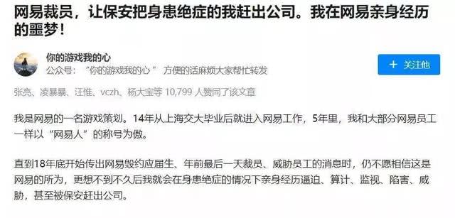 一篇名為《網(wǎng)易裁員,讓保安把身患絕癥的我趕出公司。我在網(wǎng)易親身經(jīng)歷的噩夢》的文章先是成為知乎熱帖,而后又在朋友圈刷屏,讓網(wǎng)易成為眾矢之的。