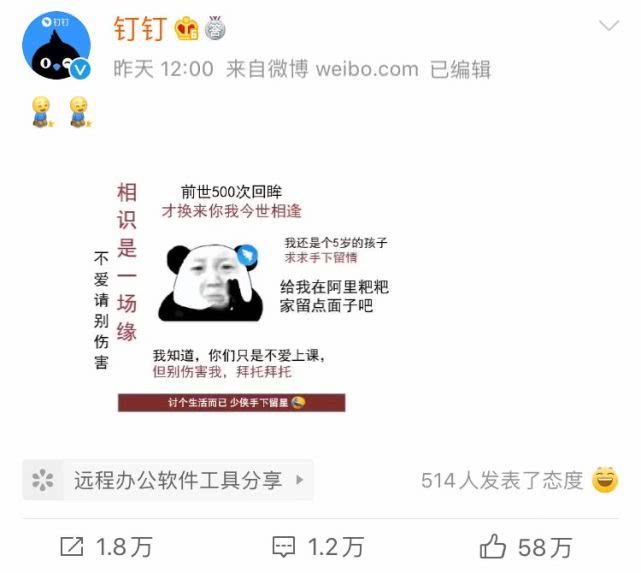 釘釘被錘,痛定思痛,發(fā)微博在線求饒,求這批小祖宗們高抬貴手。