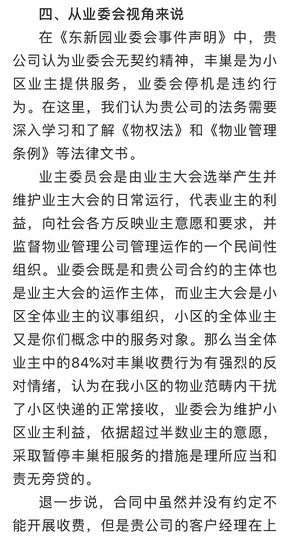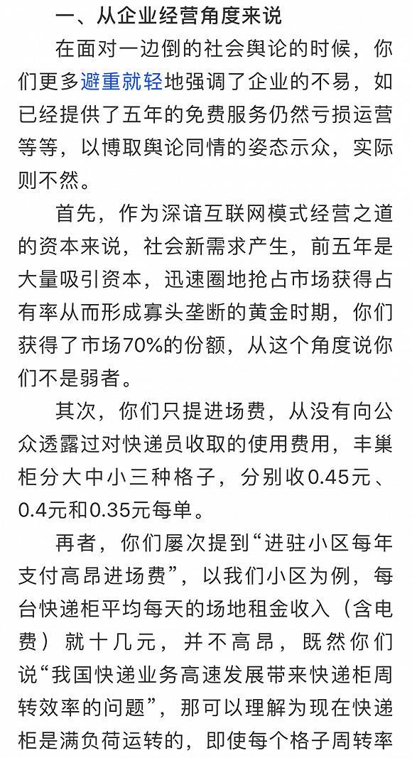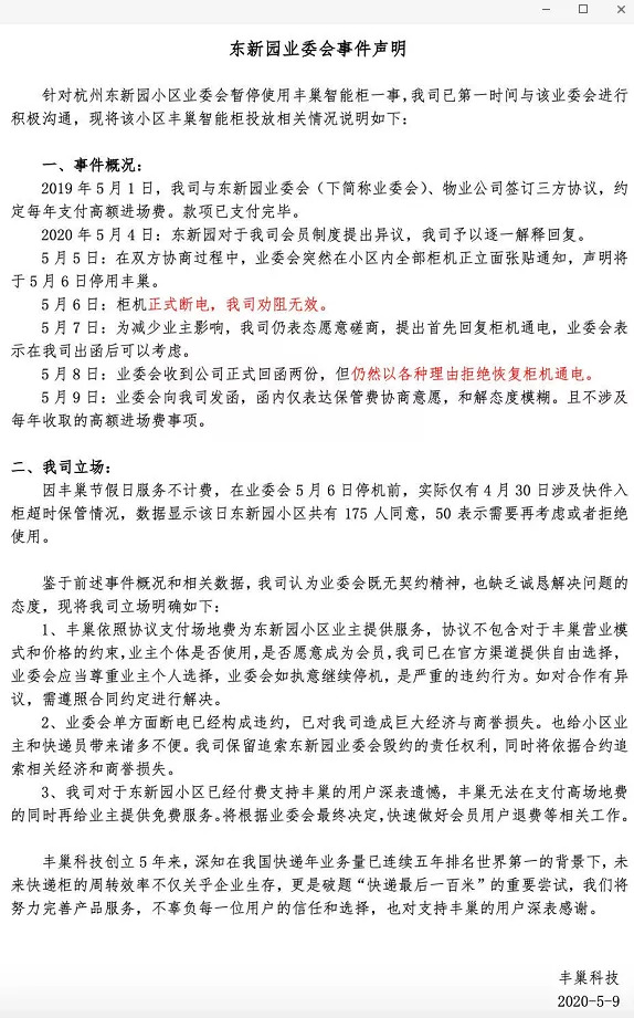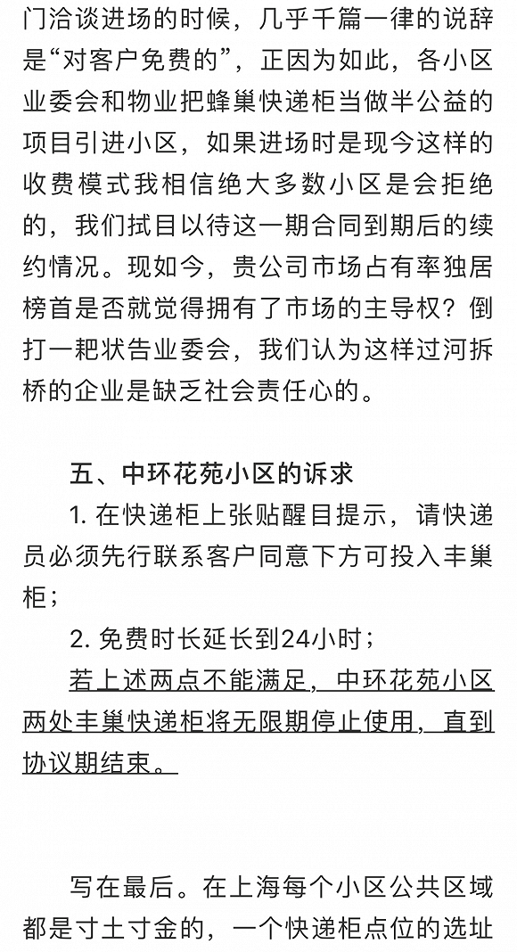 同樣的問(wèn)題,更是出現(xiàn)在豐巢寫給杭州某小區(qū)業(yè)委會(huì)的聲明中,這應(yīng)該是第一個(gè)關(guān)停豐巢貨柜的小區(qū)。顯然,豐巢很憤怒,它在“我司立場(chǎng)”中,十分強(qiáng)硬,比如“我司認(rèn)為業(yè)委會(huì)既契約精神,也缺乏誠(chéng)懇解決問(wèn)題的態(tài)度”,,還比如“豐巢無(wú)法在支付高場(chǎng)地費(fèi)的同時(shí)再給業(yè)務(wù)提供免費(fèi)服務(wù)”……