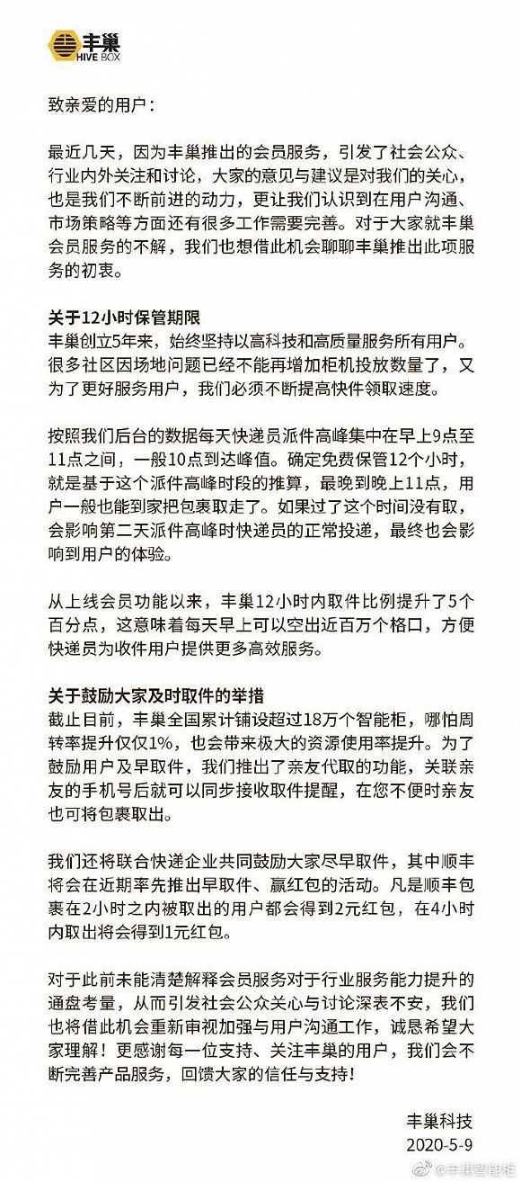 雖然豐巢終于對(duì)事前不與用戶溝通和解釋道歉了,也說(shuō)明了“12小時(shí)而不是24小時(shí)的理由”,但這份信的重點(diǎn)不是這個(gè),而是傳遞了一個(gè)核心信息: