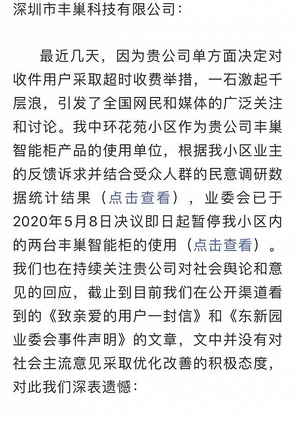 顯然,豐巢沒(méi)有給出一個(gè)可令人信服的理由,卻被一個(gè)上海某小區(qū)的業(yè)委會(huì)寫給豐巢的公開(kāi)信給第三次刷屏了。