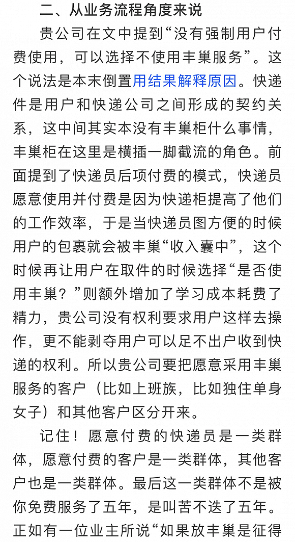 以一個(gè)普通業(yè)主的視角,把豐巢的業(yè)務(wù)模式存在的問(wèn)題,都一一列舉,引來(lái)無(wú)數(shù)共鳴,以此來(lái)說(shuō)明,你對(duì)消費(fèi)者強(qiáng)制收費(fèi)的商業(yè)模式本身就存在問(wèn)題。