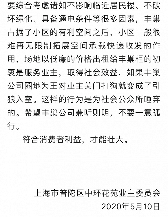 在上海每個(gè)小區(qū)公共區(qū)域都是寸土寸金的……場(chǎng)地以低廉的價(jià)格出租給豐巢柜的初衷是服務(wù)業(yè)主,取得社會(huì)效益,如果豐巢公司圈地為王,對(duì)業(yè)主關(guān)門打狗就變成了引狼入室。這樣的行為是為社會(huì)公眾所唾棄的。