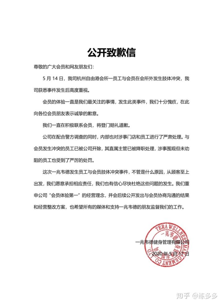 5月17日事件曝光后,一兆韋德官方微博迅速發(fā)布公開致歉信。
