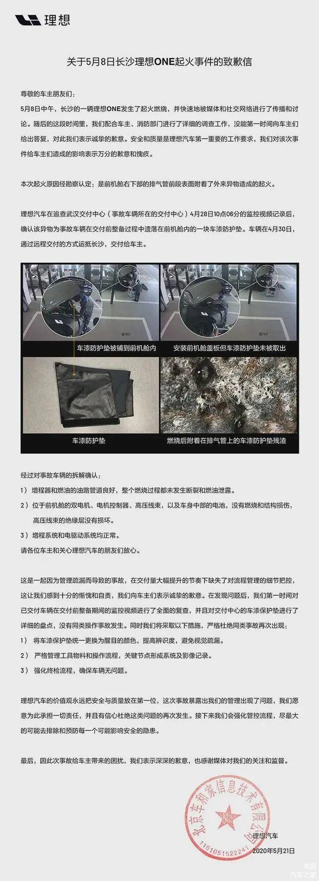 半個月后的5月21日,理想汽車在官微上公布了5月8日長沙理想ONE自燃的原因并道歉。根據(jù)理想汽車的表述,本次起火原因經(jīng)勘查認(rèn)定:是前機艙右下部的排氣管前段表面附著了外來異物造成的起火。此異物為事故車輛在交付前整備過程中遺落在前機艙內(nèi)的一塊車漆防護墊。