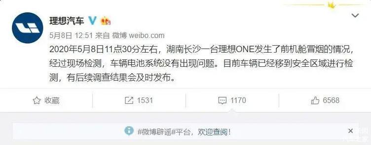 隨后新浪微博@理想汽車第一時間做出了事故回應(yīng):2020年5月8日11點30分左右,湖南長沙一臺理想ONE發(fā)生了前機艙冒煙的情況,經(jīng)過現(xiàn)場檢測,車輛電池系統(tǒng)沒有出現(xiàn)問題。目前車輛已經(jīng)移到安全區(qū)域進行檢測,有后續(xù)調(diào)查結(jié)果會及時發(fā)布。