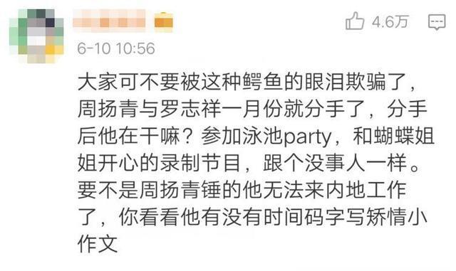 不過還是有網(wǎng)友警示大家表示千萬不要被他騙了,因為羅志祥和周揚青分手是在1月份,但是1月份到4月份之間羅志祥照樣和蝴蝶姐姐開開心心上節(jié)目,照樣開泳池派對,根本毫無悔過之心。而現(xiàn)在羅志祥頻頻道歉也是因為自己的工作受阻,急于復(fù)工而已。