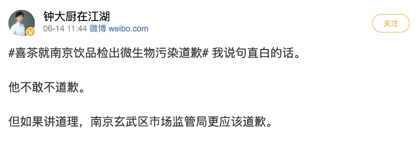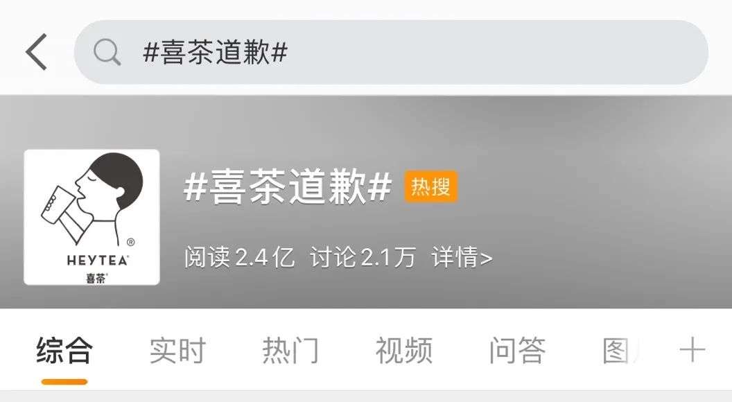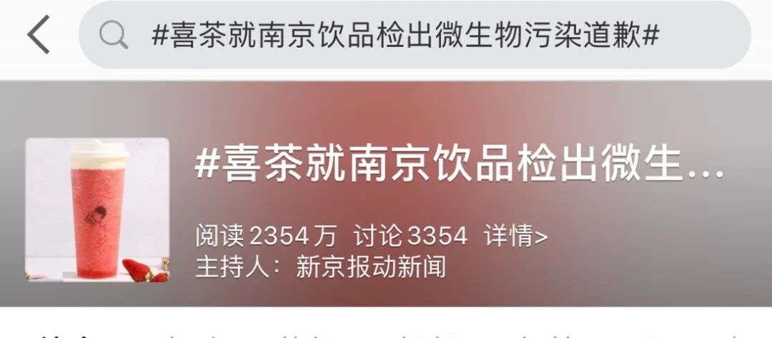 新浪微博上,#喜茶就南京飲品檢出微生物污染道歉#這條Tag,閱讀量超過(guò)2000萬(wàn)。