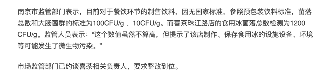 這種抽檢,對(duì)飲品業(yè)的夏季來(lái)說(shuō)其實(shí)很常見(jiàn)。但南京玄武區(qū)市場(chǎng)監(jiān)管局采用的抽檢標(biāo)準(zhǔn),很罕見(jiàn)。我們看下新聞原文: