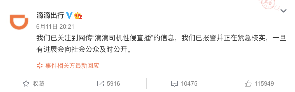 6月11日 19:24,在事件發(fā)生的第一時(shí)間,滴滴在微博進(jìn)行了回應(yīng):“我們已關(guān)注到網(wǎng)傳「滴滴司機(jī)性侵直播」的信息,我們已報(bào)警并正在緊急核實(shí),一旦有進(jìn)展會(huì)向社會(huì)公眾及時(shí)公開。”。企業(yè)回應(yīng)時(shí)間越滯后,負(fù)面信息蔓延得就越快、謠言就會(huì)散播更廣泛,局面就越難控制,與媒介和公眾溝通難度也更大,如果做鴕鳥狀,公眾則陷入猜疑、沮喪狀態(tài),受傷的是品牌。