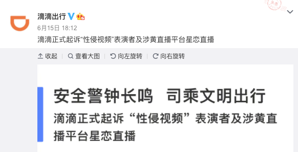 在公眾認(rèn)為到此這一事件已被劃上句號(hào)時(shí),6月15日 18:12:滴滴宣布正式起訴“性侵視頻”表演者及涉黃直播平臺(tái)星戀直播,對于當(dāng)時(shí)未經(jīng)核實(shí)發(fā)布#滴滴司機(jī)直播性侵案#話題的網(wǎng)友,則不予起訴。對于滴滴來說只是真相大白是不夠的,拿起法律武器捍衛(wèi)平臺(tái)特別是網(wǎng)約車司機(jī)群體的利益,滴滴作為平臺(tái)責(zé)無旁貸。