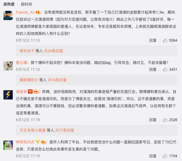 網(wǎng)友Francis_Xx在本條微博下的評論獲得最高贊:“沒有使用就沒有發(fā)言權(quán),那天看了一下自己打滴滴的金額累計(jì)起來有1.3w,期間僅投訴過一次滴滴師傅(因?yàn)閷Ψ綉B(tài)度問題,讓我有點(diǎn)惱火)除此之外幾乎都給了5星好評,每一位滴滴師傅都是大家周圍的普通人,無論是快車、專車還是順風(fēng)車師傅。上來就無腦噴滴滴群體這樣的人和地域黑的人有什么區(qū)別?”