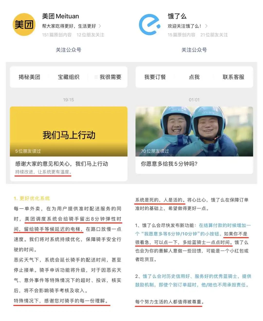 一個小細(xì)節(jié)就能看出,餓了么聲明的頭圖是兩位微笑的快遞員,配上標(biāo)題“你愿意多給我5分鐘嗎?”,美團(tuán)則是“我們在行動”。